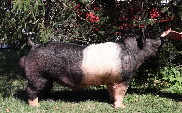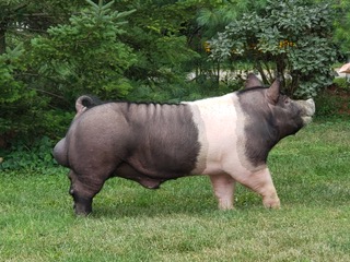 Overlooked by all is the only way to describe this boar and after the phone calls we are so happy to own him. When he walked into the Indiana show ring there has not been a more powerful massive boar out in our eyes tall at the point of the shoulders and wide right to the ground. He carries a tremendous rib cage never runs down hill, this boar has huge feet and bone that will give you what Hampshires need -- more width with control of the rear wheels. Better females that is our goal for you!